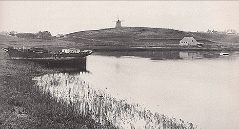 This photo was taken in November 1903 and shows the Godfrey Windmill in its original location on the east side of Stage Harbor Road. The mill is viewed from the north side of Bridge Street, near the western end of the bridge. The mill was moved to its current location in Chase Park in 1955.
